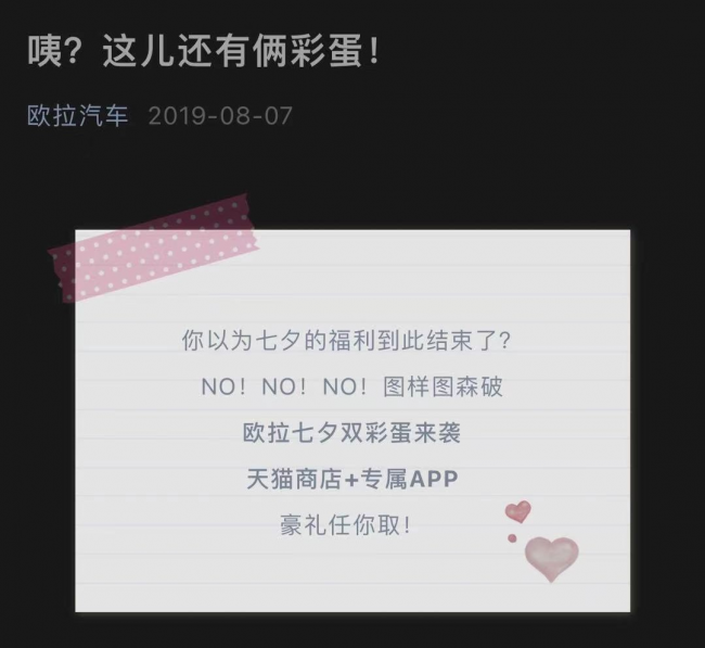 2019年,欧拉推出了七夕双彩蛋福利:女神试驾礼和女神购车礼。1元试驾即可以获得50元天猫超市卡;购车礼则是在活动区间购车,可以获得包含无线充电器、心上人印象礼盒、身体按摩仪等价值500元的气质女神礼包一份。
