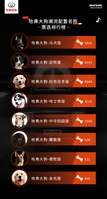 今年6月哈弗大狗开启“大狗养成模式”粉丝营销互动,首开汽车圈“一字万金”全球征名活动先河。得益于超高的关注度和诚意十足的“一字万金”奖励机制,哈弗大狗全球征名活动吸引了海内外众多网友粉丝的参与和支持。延续全球征名热度,继续大狗养成模式,近日哈弗大狗开启了“潮配你做主!大狗配置名称全球命名票选“互动,再次邀约网友粉丝行使为大狗做主的权利,为中意的哈弗大狗配置名称投票。最终马犬版3806票、边牧版3745票、拉布拉多版3665票、哈士奇版3106票,4大猛宠以绝对领先的优势胜出,成为哈弗大狗配置版型名称。
