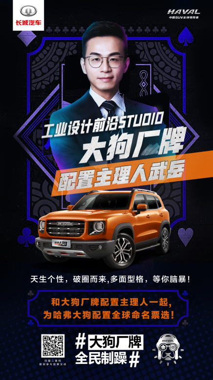 承接大狗厂牌主理人天团打造思路,在配置名称票选互动中哈弗大狗邀请了年轻圈层的代表——工业设计前沿Studio 主理人武岳,作为大狗厂牌的配置主理人与广大网友粉丝共同为配置名称票选打CALL,让哈弗大狗的人气热度再度攀升。